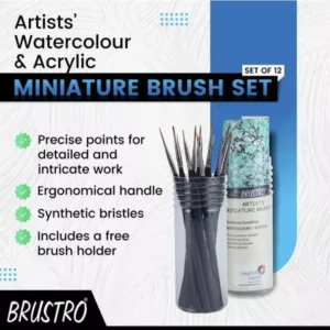 The BRUSTRO Watercolour & Acrylic Miniature Brush Set featuring synthetic hair, ideal for watercolour, gouache, and acrylic painting. This Pack of 12 brushes is designed for artists who require fine detail and precision in their work. The high-quality synthetic bristles are soft yet durable, ensuring smooth application and excellent color retention. Perfect for painting intricate…