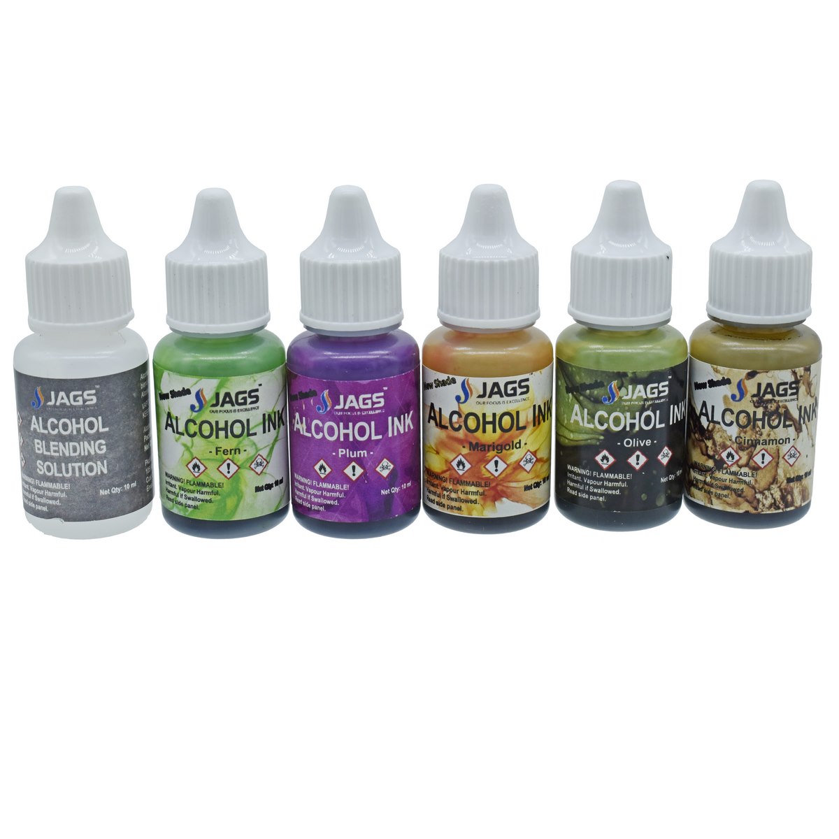 1. Material: Alcohol, Pack contains 5 Alcohol Inks 10ml each and 1 Alcohol Blending Solution 10 ml. Pack of Cinnamon, Olive, Marigold, Plum, Fern, and Alcohol blending solution.