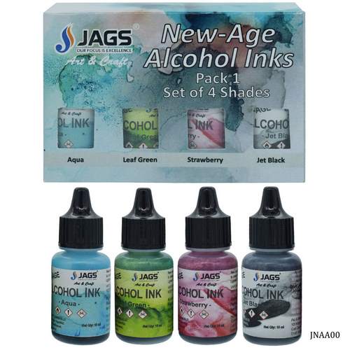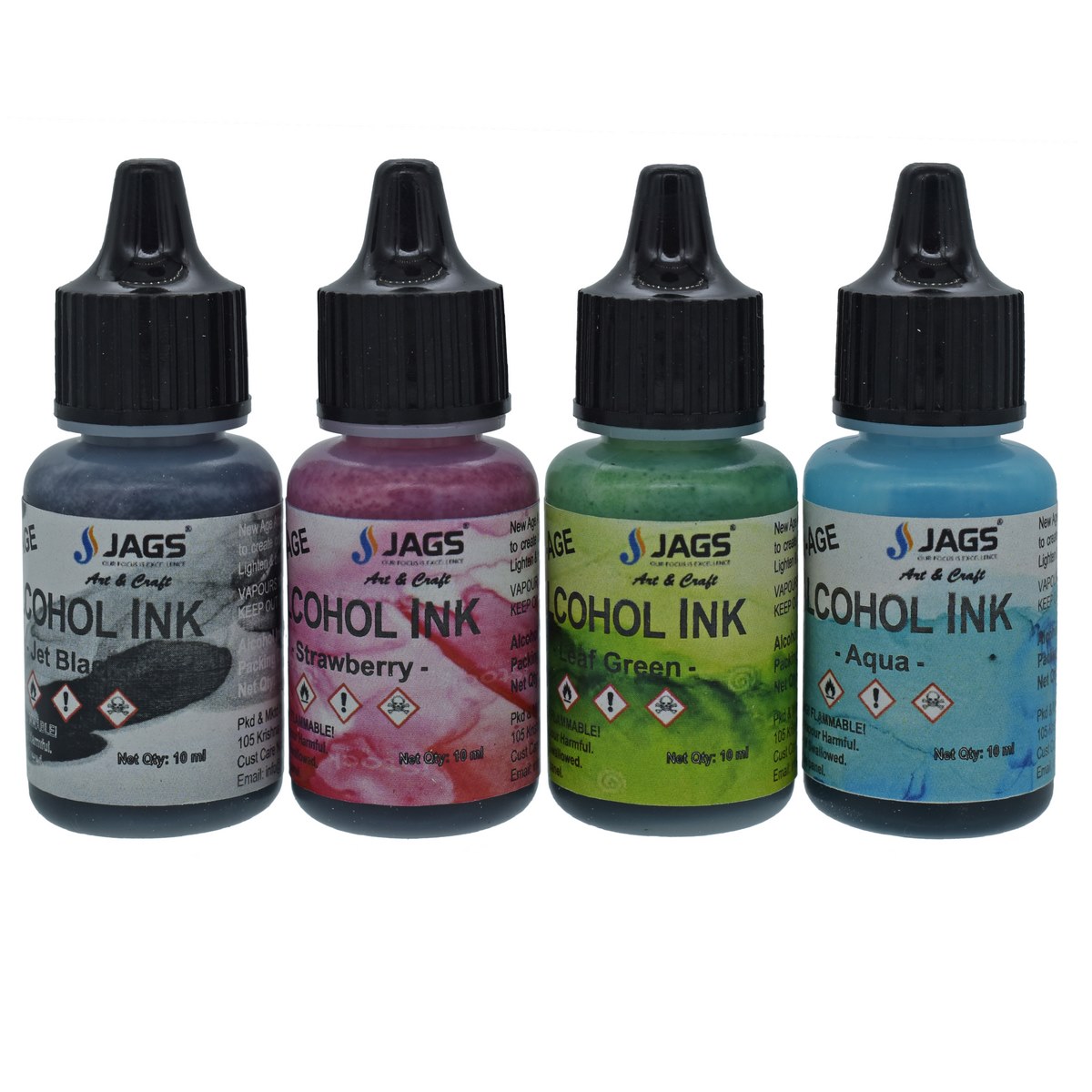 1. Material: Alcohol, Pack contains 4 Alcohol Inks 10ml each. Pack of Aqua, Leaf Green, Strawberry & Jet Black.