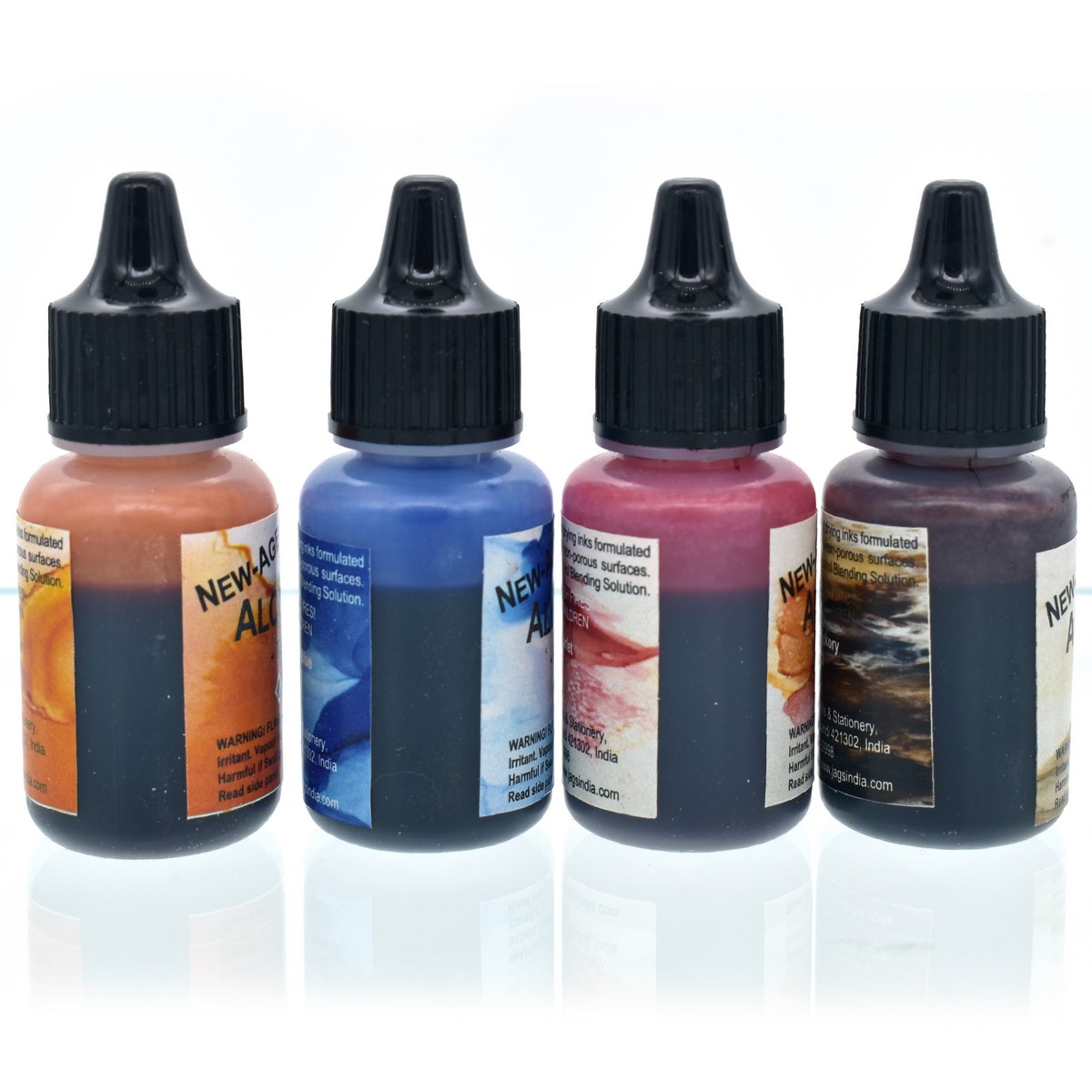 1. Material: Alcohol, Pack contains 4 Alcohol Inks 10ml each. Pack of Tangerine, Royal Blue, Scarlet, & Hickory.