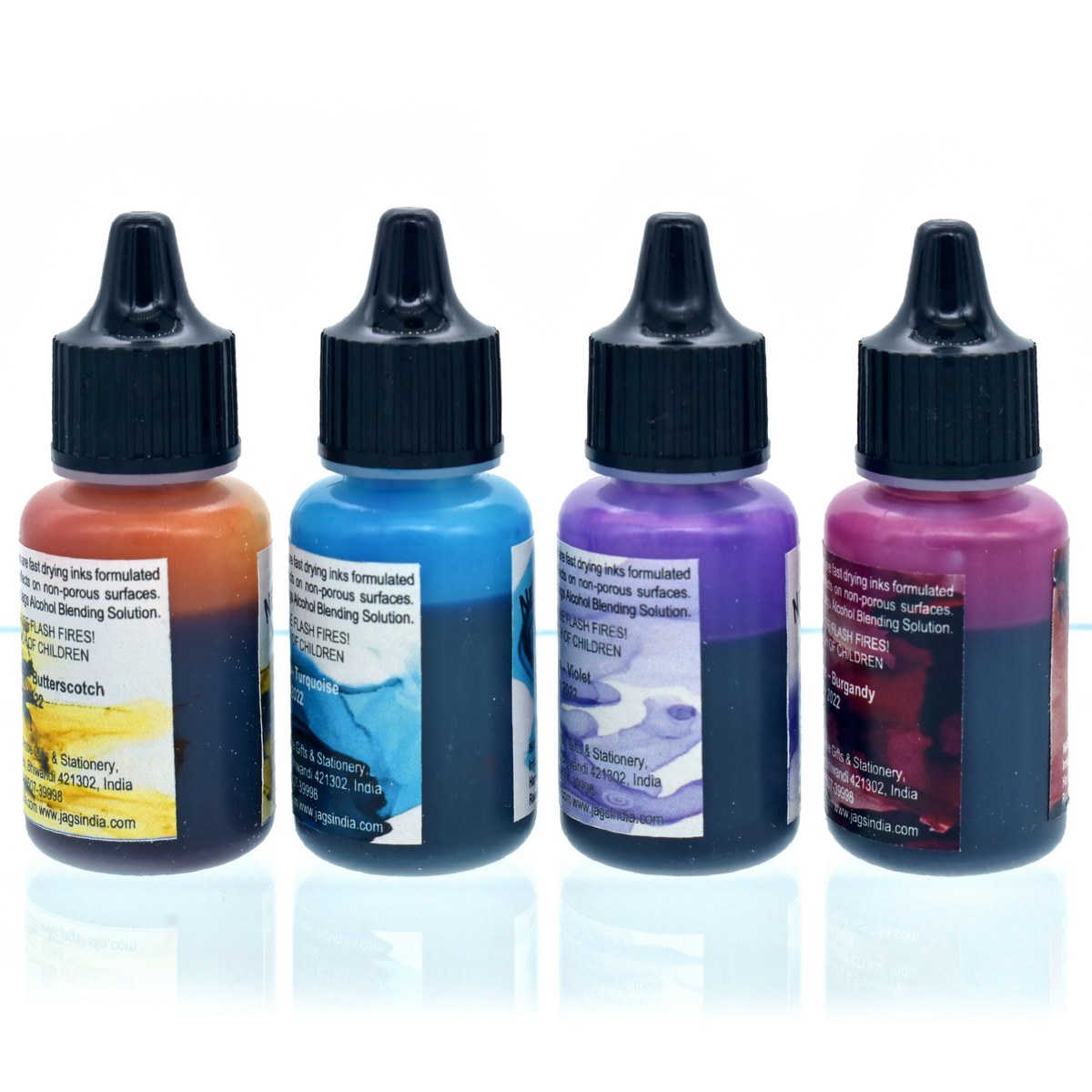 1. Material: Alcohol, Pack contains 4 Alcohol Inks 10ml each. Pack of Butterscotch, Turquoise, Violet, & Burgundy.