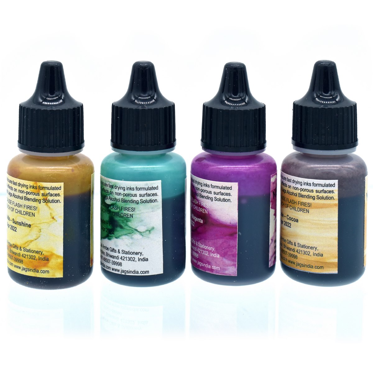 1. Material: Alcohol, Pack contains 4 Alcohol Inks 10ml each. Pack of Sunshine, Pine, magenta & Cocoa.